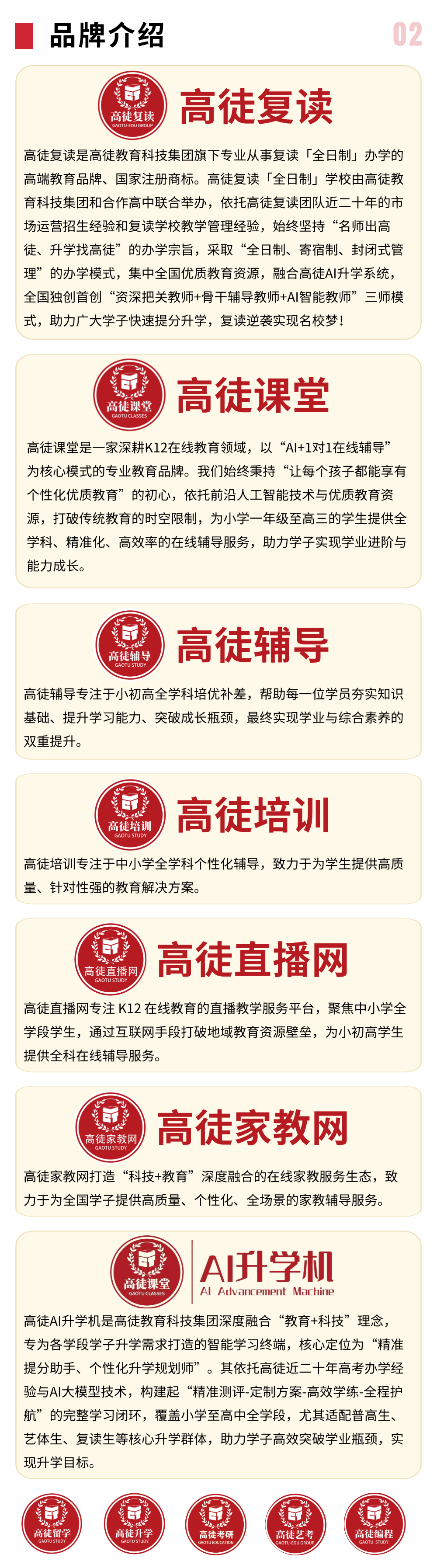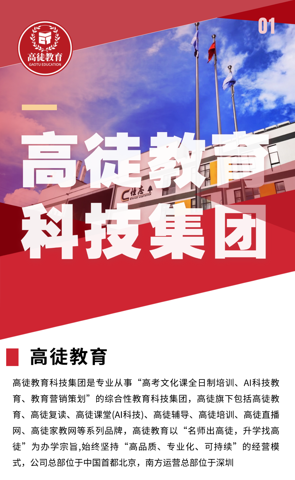 高徒教育科技集团是专业从事“高考文化课全日制培训、AI科技教育、教育营销策划”的综合性教育科技集团,高徒旗下包括高徒教育、高徒复读、高徒课堂(AI科技)、高徒辅导、高徒培训、高徒直播网、高徒家教网等系列品牌,高徒教育以“名师出高徒,升学找高徒”为办学宗旨,始终坚持“高品质、专业化、可持续”的经营模式,公司总部位于中国首都北京,南方运营总部位于深圳。